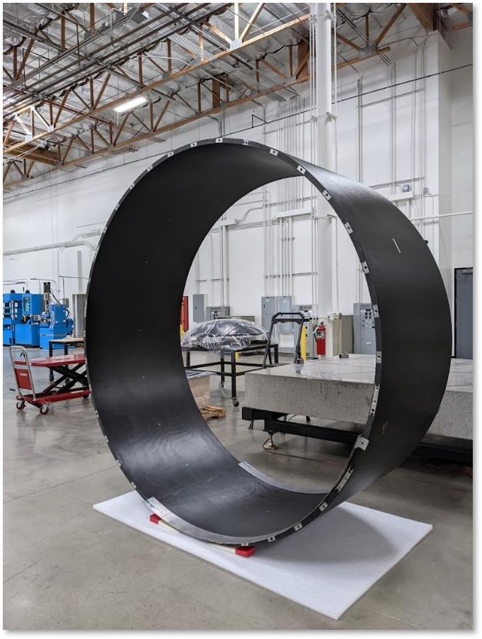 The delivered hardware is 5.3-meters long by 2.4-meters in diameter. It is constructed of ultra-high-modulus prepreg and Nomex honeycomb core made with PMT-F6 cyanate ester resin. There are 1680 metallic inserts made of solid carbon epoxy, titanium and stainless steel; and it includes two 110 MSI carbon fiber (K13916/ F6) rails to support scientific instruments. Surface accuracy requirements were tested to 2.4mm cylindricity inhouse before shipment.