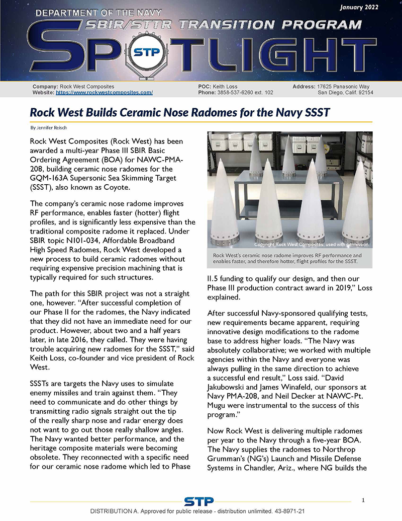 Rock West Composites Completes Prototype Radome Using Innovative, Cost-Competitive, Low-dielectric Epoxy Quartz Materials